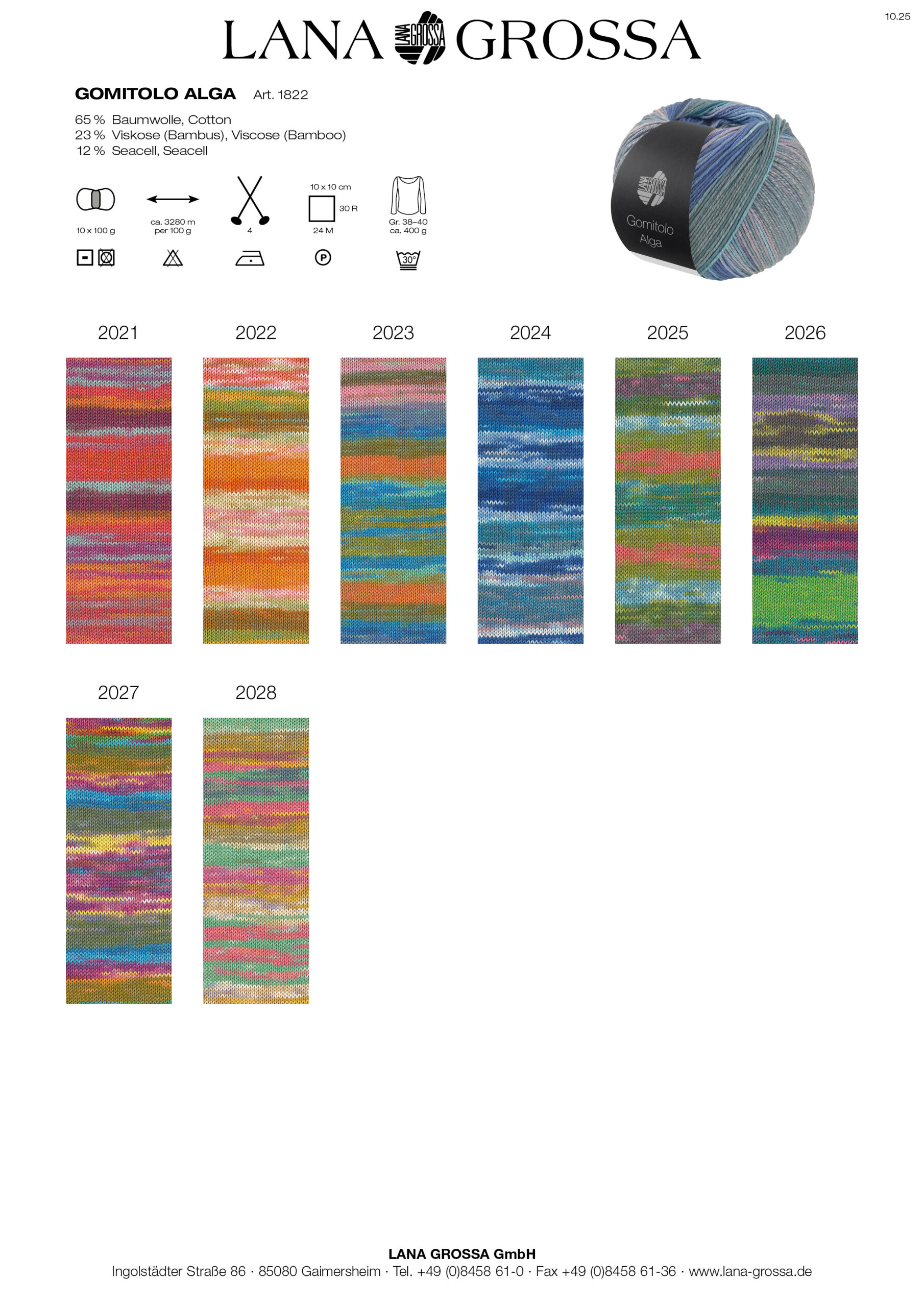 | Farbe | 2021 Rot/Orange/Fuchsia/Mint/Brombeer/Grau, 2022 Gelbgrün/Gelb-/Rotorange/Lachs/Weiß/Türkis/ Ocker/Zartgrün/Rosa, 2023 Blau/Jeans/Jade/Rosa/Lila/Khaki/Oliv/Orange/ Gelbgrün, 2024 Weiß/Hell-/Dunkel-/Eisblau/Grau/Türkis/ Petrol/Altrosa, 2025 Weiß/Hellblau/Blau/Hell-/Dunkelgrün/Pink/ Pflaume/Türkis/Lachs/Petrol, 2026 Fuchsia/Violett/Pistazie/Petrol-/Graugrün/Lila/ Graphitgrau/Frühlingsgrün, 2027 Graugrün/Türkis/Fuchsia/Gelb/Frühlingsgrün/ Orange/Oliv/Himmelblau/Blau/Altrosa/Weiß, 2028 Senfgelb/Rosa/Fuchsia/Jade/Weiß/Gelb/Petrol/ Himbeer/Zartlila/Natur |